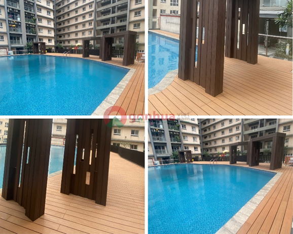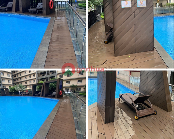 Ở dự án Cosmo City, Gỗ Nhựa Việt Nam thi công hạng mục sàn hồ bơi gỗ nhựa ngoài trời. Sàn gỗ nhựa 2 lớp phủ polymer đang ngày càng được ưa chuộng cho các công trình hồ bơi ngoài trời nhờ hội tụ đầy đủ yếu tố bền – đẹp – an toàn. Với lớp phủ polymer hiện đại, bề mặt sàn Hwood chống thấm nước, không cong vênh hay mục nát dù thường xuyên tiếp xúc với nước hồ bơi.