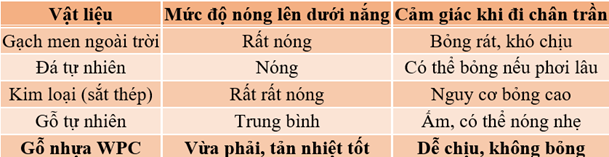 Vậy “Sàn gỗ nhựa ngoài trời có nóng không? Có bị bỏng chân khi trời nắng gắt?”