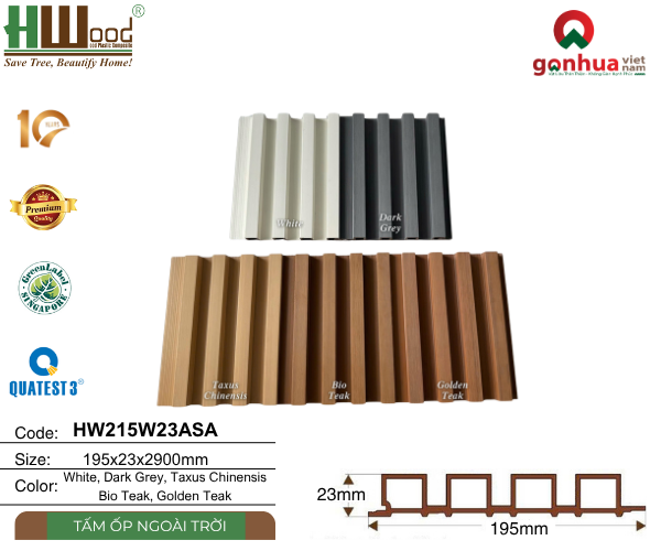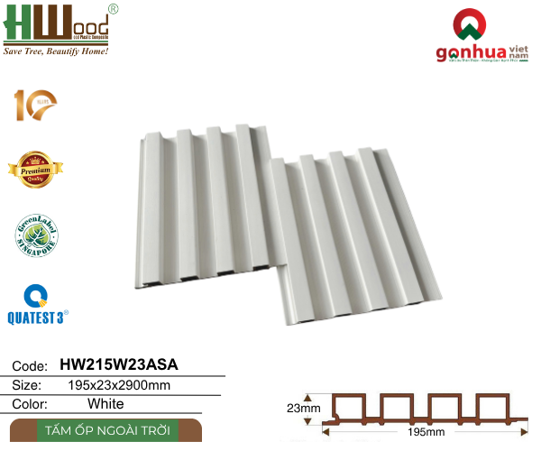 Tấm lam sóng HW215W23ASA được sản xuất từ vật liệu gỗ nhựa ngoài trời thế hệ mới, kết hợp cùng lớp phủ ASA cao cấp: