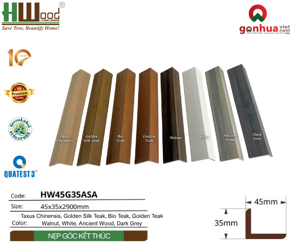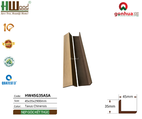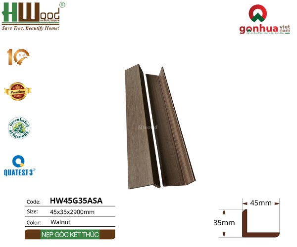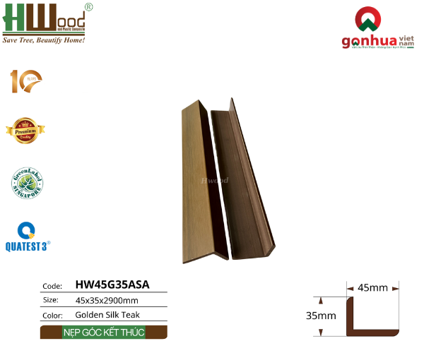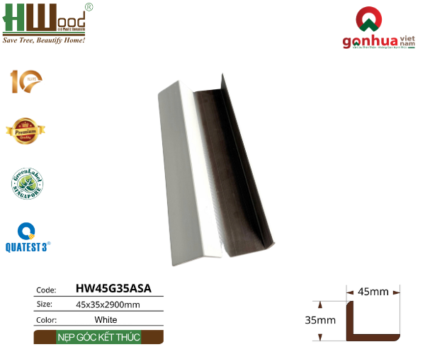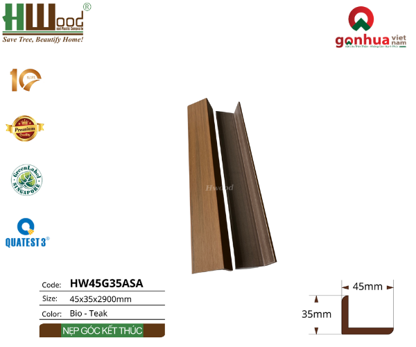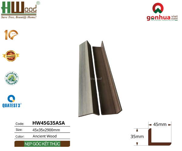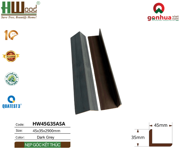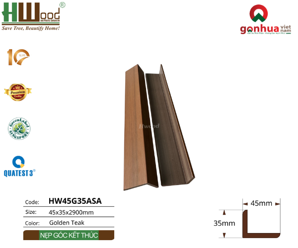 Nếu bạn đang tìm kiếm một giải pháp vừa thẩm mỹ vừa bền bỉ để hoàn thiện các góc vuông trong công trình ốp lát ngoài trời, thì nẹp góc kết thúc HW45G35ASA chính là lựa chọn không thể bỏ qua. Đây là dòng phụ kiện gỗ nhựa cao cấp phủ ASA, chuyên dùng để bọc các góc, kết thúc mép tấm ốp hoặc sàn ngoài trời – giúp tổng thể công trình liền mạch, sang trọng và bền đẹp theo thời gian.