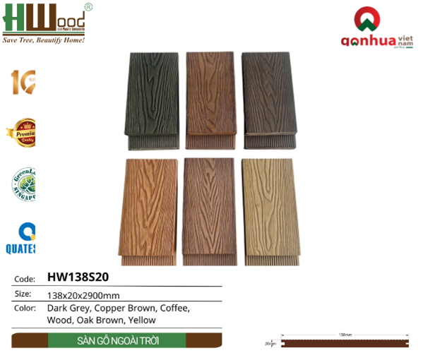 Sàn gỗ HW138S20 đến từ thương hiệu Hwood, đạt tiêu chuẩn chất lượng quốc tế, đã được kiểm nghiệm bởi Quatest 3, đảm bảo độ an toàn và độ bền lâu dài. Đây chính là lựa chọn hoàn hảo cho không gian ngoài trời đòi hỏi sự bền bỉ, sang trọng và đẳng cấp.