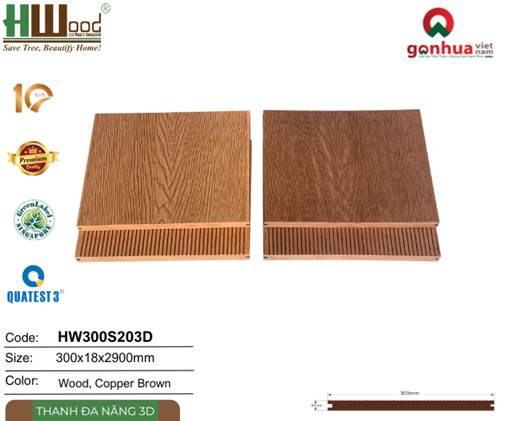 Sản phẩm thanh đa năng HW300S203D này sở hữu các đặc tính của vật liệu WPC, giúp nó trở thành giải pháp lý tưởng cho không gian ngoài trời: