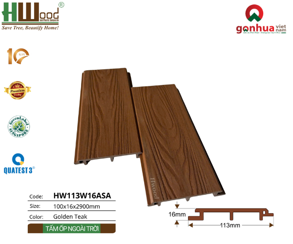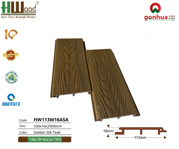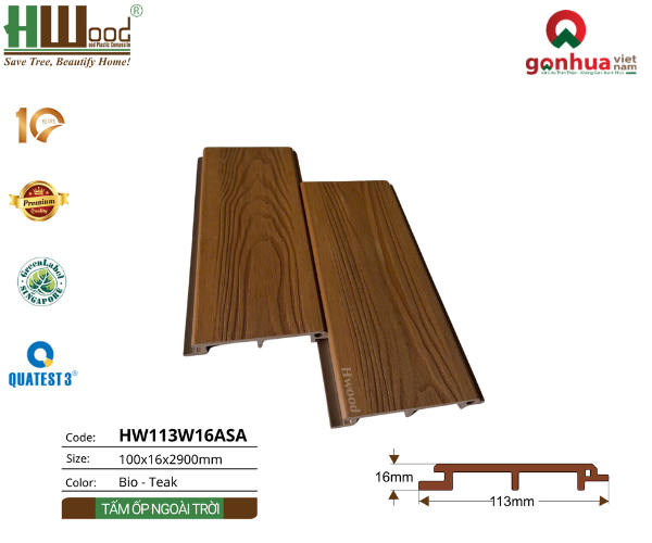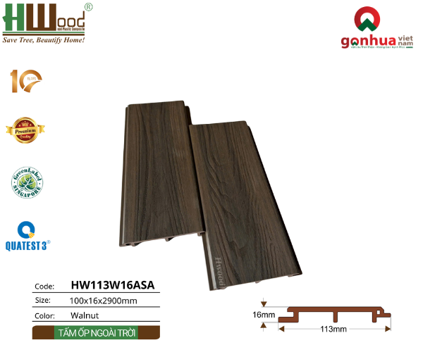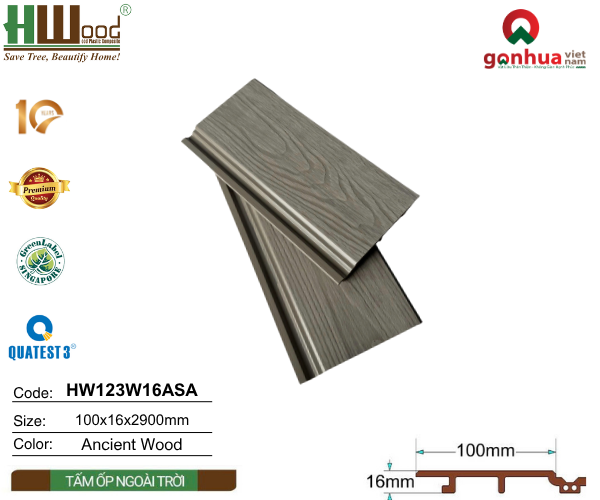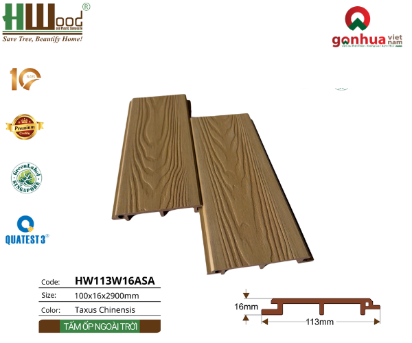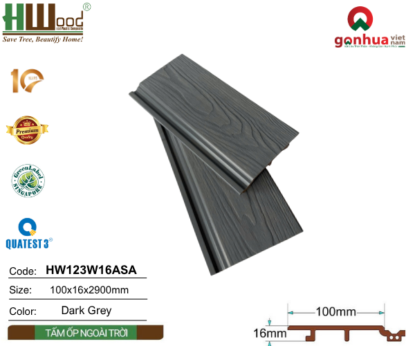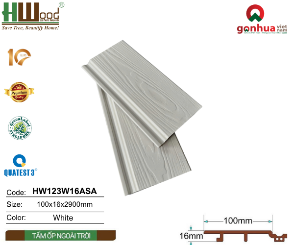 - Tấm ốp HW123W16ASA của nhà Hwood được phủ hai lớp ASA(acrylic styrene acrylonitrile) một loại nhựa nhiệt dẻo chống bạc màu, nên có độ bay màu dưới 5%.