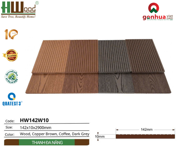 Thanh đa năng HW142W10 thương hiệu Hwood được sản xuất bằng công nghệ ép đùn khép kín ở nhiệt độ cao với thành phần chính bao gồm: