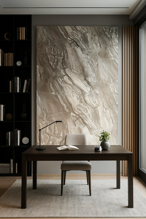 Vân đá Travertine nổi bật với đường vân sóng tự nhiên đặc trưng, cùng gam màu sáng đến trung tính hòa quyện với vân đậm hơn, tạo nên hiệu ứng tự nhiên, tinh tế và đầy cuốn hút – tái hiện chân thực vẻ đẹp của đá vôi thật trong từng chi tiết.