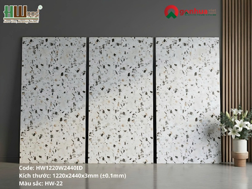 Tấm PVC giả đá vân cẩm thạch Terrazzo Hwood được sản xuất với độ dày 3mm, kích thước tiêu chuẩn 1220mm x 2440mm, mang lại khả năng thi công linh hoạt cho mọi không gian.