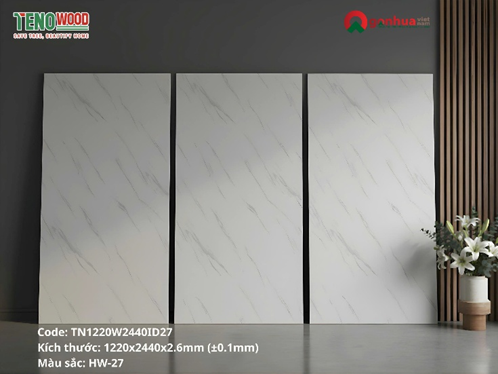 Tấm ốp TenoWood HW-27 (mã TN1220W2440ID27) là dòng tấm ốp nhựa giả đá Hwood được thiết kế mô phỏng vẻ đẹp tinh tế của đá marble trắng Carrara – loại đá tự nhiên nổi tiếng của Ý.