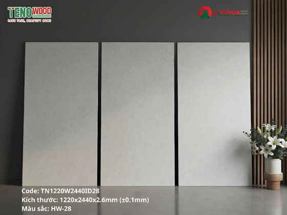 Tấm ốp TenoWood HW-28 (mã TN1220W2440ID28) là dòng tấm ốp nhựa giả đá từ thương hiệu Hwood mang phong cách tối giản hiện đại (Minimalist) với tông màu trắng ngà pha xám nhẹ.