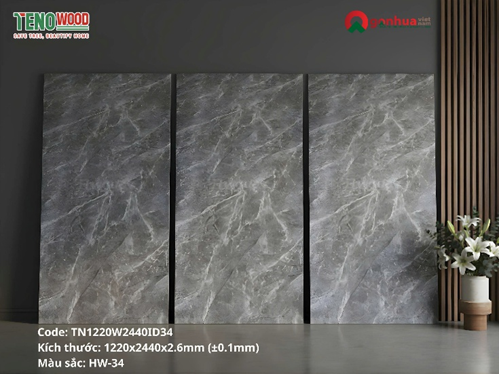 Trong số đó, tấm ốp Hwood TN1220W2440ID34 (màu HW-34) nổi bật với họa tiết vân đá xám nhạt nhẹ nhàng, tinh tế, mang phong cách tối giản hiện đại (Minimalism) – rất phù hợp cho căn hộ, văn phòng, showroom,...