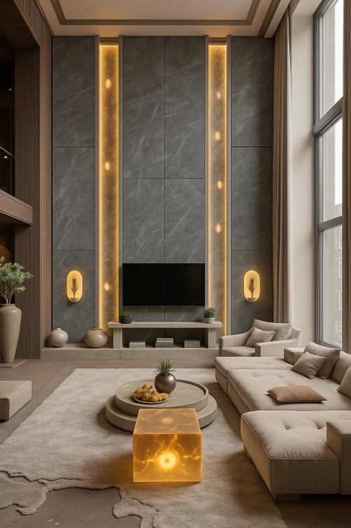 Ốp tường TV – backdrop trang trí: Tăng chiều sâu và sự sang trọng cho khu vực trung tâm.