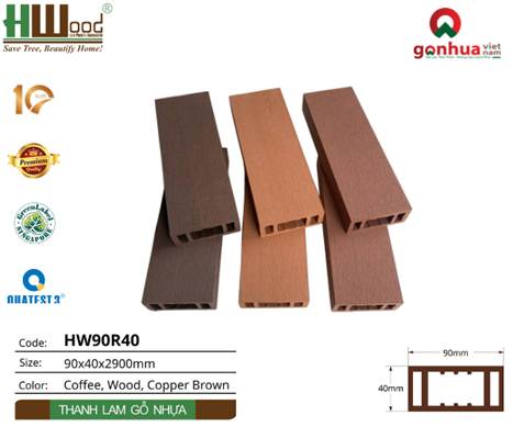 Thanh lam gỗ nhựa HW90R40 thương hiệu Hwood được sản xuất theo công nghệ ép đùn hiện đại, với cấu trúc hộp rỗng và tỷ lệ pha trộn tối ưu giữa bột gỗ và nhựa composite. Cụ thể: