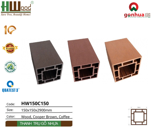Trụ gỗ nhựa ngoài trời thương hiệu Hwood HW150C150 được làm từ vật liệu composite (bao gồm bột gỗ, nhựa HDPE và chất phụ gia, gồm: