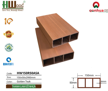 Thanh lam gỗ nhựa HW150R50 Golden Teak là dòng gỗ nhựa phủ ASA cao cấp. Thanh lam hộp ASA thương hiệu Hwood là sự kết hợp hoàn hảo giữa 60% nhựa PVC, 30% bột gỗ, 10% chất phụ gia và lớp phủ ASA giúp lam hộp Hwood bền bỉ với thời gian lựa chọn lý tưởng cho mọi công trình.