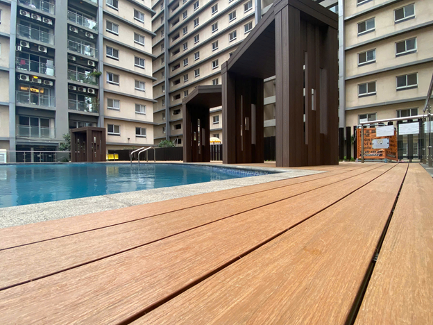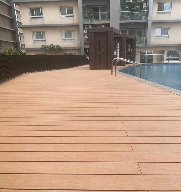 Một góc gần bề mặt gỗ nhựa Hwood khu đi lại hồ bơi khu căn hộ Cosmo City- Quận 7