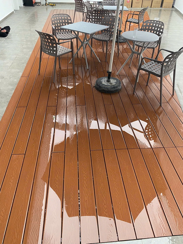 3.Ứng dụng sàn nhựa ngoài trời lỗ tròn 3D HW140E25 màu Wood: