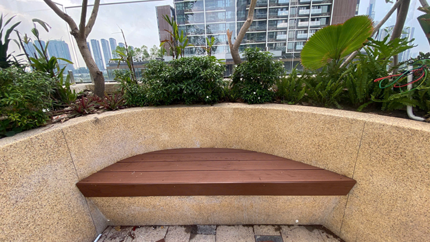 Một góc ghế ngồi ngoài trời sử dụng gỗ nhựa Hwood của khu căn hộ cao cấp Quận 2- Thủ Thiêm The River