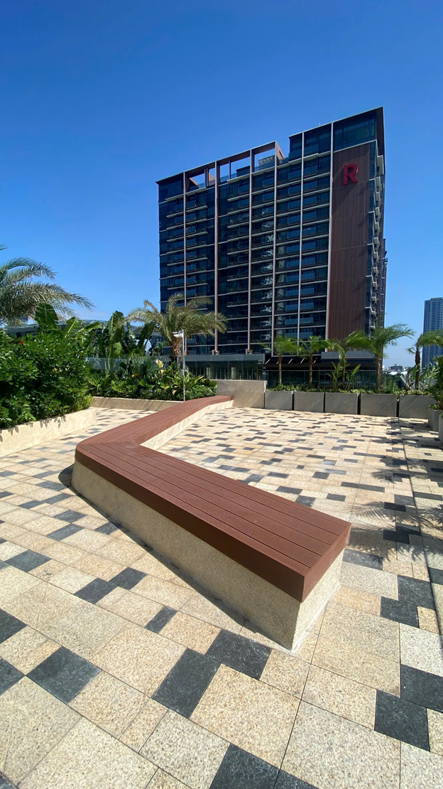Dãy ghế ngồi ngoài trời sử dụng gỗ nhựa Hwood của một khu căn hộ cao cấp Quận 2- Thủ Thiêm The River