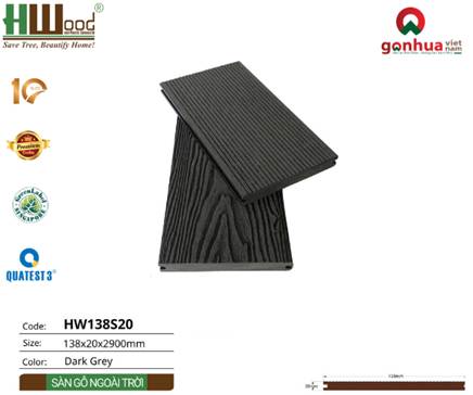 Sàn gỗ nhựa ngoài trời Hwood HW138S20 màu Dark Grey được sản xuất theo công nghệ ép đùn hiện đại, cấu tạo từ: