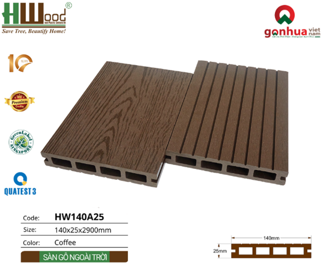 SÀN NHỰA HWOOD - HW140T25 MÀU COFFEESàn gỗ nhựa ngoài trời Hwood màu Coffee một mặt vân sọc lớn, một mặt sọc nhỏ