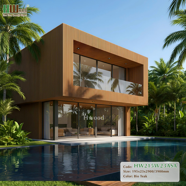 Được sản xuất bởi thương hiệu Hwood, dòng gỗ nhựa ngoài trời phủ ASA này không chỉ nổi bật về tính năng mà còn giữ màu sắc bền bỉ đến hơn 20 năm sử dụng.