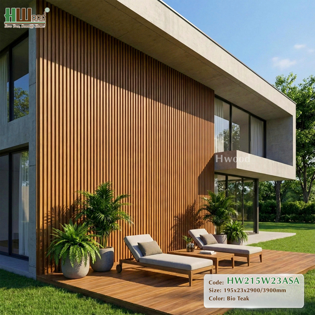 Tấm ốp lam sóng ngoài trời phủ ASA HW215W23ASA màu Bio Teak chính là giải pháp tối ưu cho các công trình hiện đại, mang vẻ đẹp mộc mạc như gỗ thật nhưng bền chắc như nhựa kỹ thuật cao cấp.