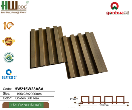 Nếu bạn đang tìm kiếm tấm ốp ngoài trời phủ ASA bền màu, chống nắng mưa, thẩm mỹ cao và dễ bảo trì, thì lam sóng Hwood HW215W23ASA màu Golden Silk Teak chính là lựa chọn lý tưởng.