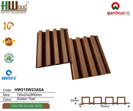 Với vẻ đẹp ấm áp, sang trọng của màu Golden Teak cùng những ưu điểm vượt trội về độ bền, lam sóng HW215W23ASA là lựa chọn lý tưởng cho nhiều hạng mục công trình ngoại thất: